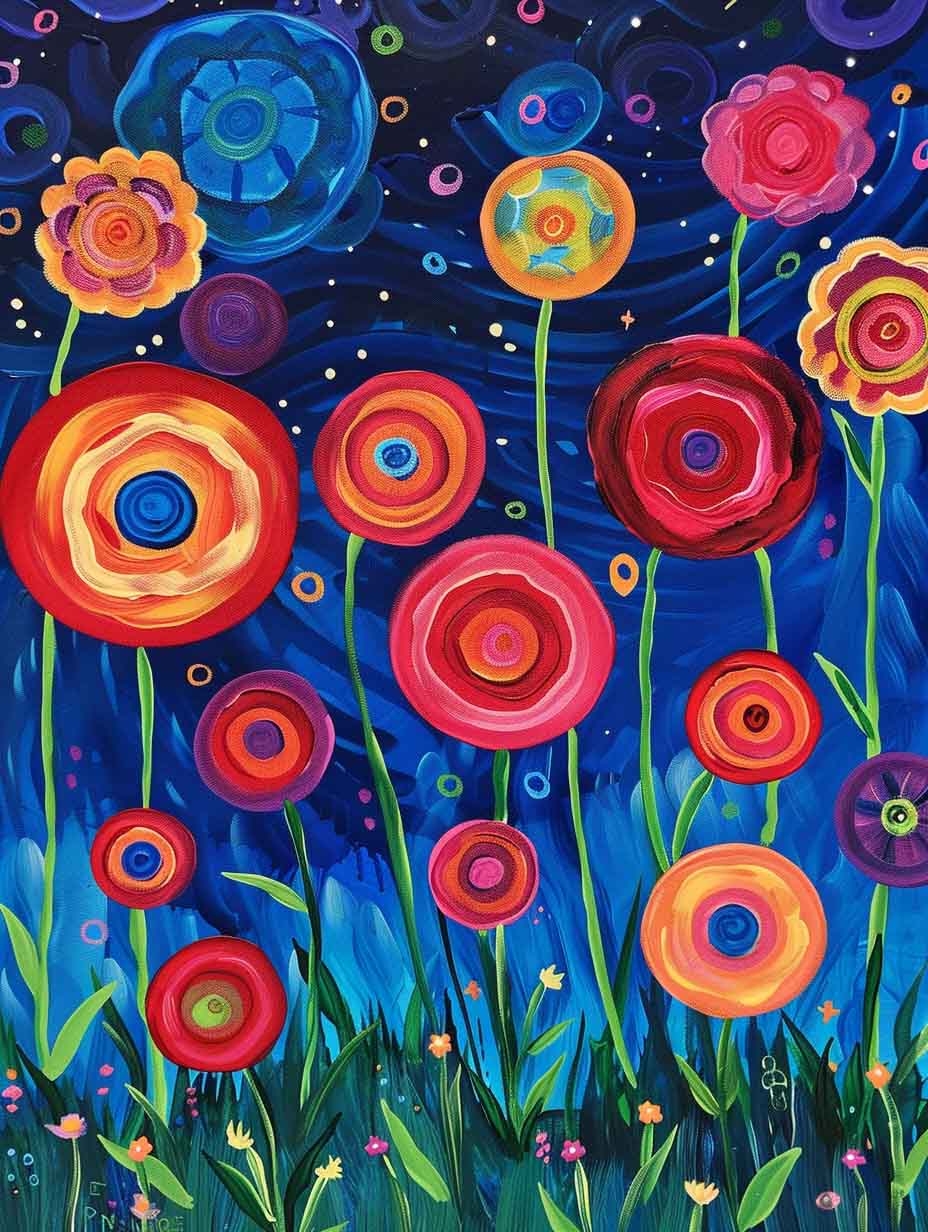 ๐ The deep blue background, speckled with swirling celestial orbs and glowing accents, creates a surreal landscape that feels both vibrant and otherworldly. ๐