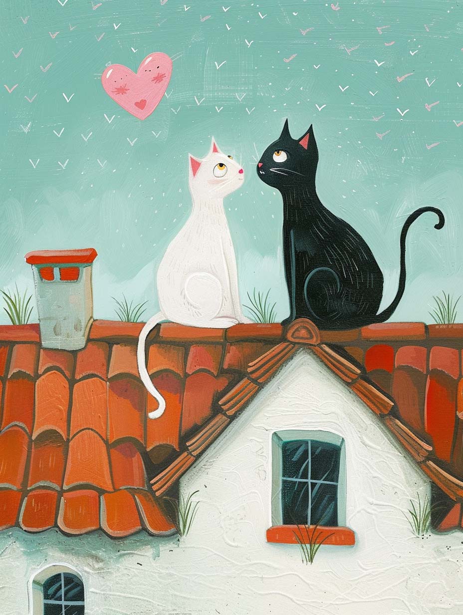 ๐ Celebrate love with this charming artwork featuring a white and black cat gazing at each other under a sky full of hearts. ๐
