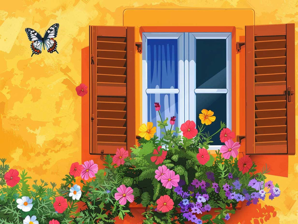 ๐ This charming design features a vibrant butterfly fluttering near a blooming window box against a cheerful yellow-orange wall.ย ๐